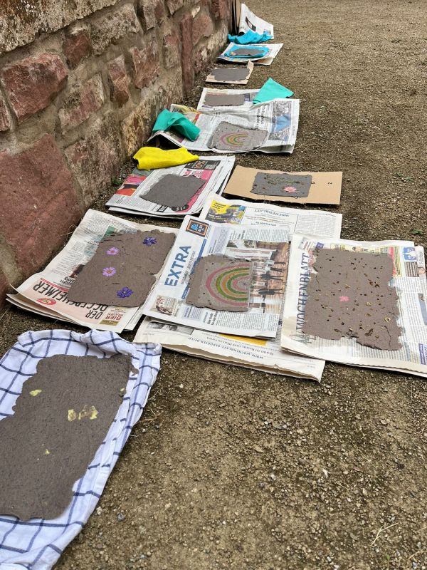 Dabei wurde das Papier nicht nur selbst geschöpft, sondern anschließend auch liebevoll mit echten Blumen und Samen verziert. Die Aktion vermittelte auf anschauliche Weise, wie aus vermeintlichem Abfall neue, sinnvolle Produkte entstehen können, und verband Umweltbildung mit kreativem Arbeiten.