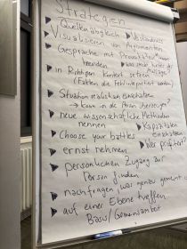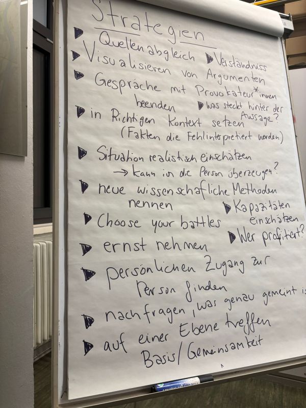 Zum Schluss wurde erarbeitet, wie man dann richtig auf diese Desinformation reagiert. Aus der Arbeit der Aktiven sowie aus persönlichen Erfahrungen wurden reale Beispiele eingebracht. In Kleingruppen wurden Aussagen wie „Den Klimawandel gibt es nicht“ besprochen und Strategien des Umgangs entworfen. Nicht immer hilft es den Menschen mit Fakten gegenüberzutreten. Es ist genau so wichtig die Beweggründe und Emotionen einer Person zu verstehen und hierauf empathisch zu reagieren.