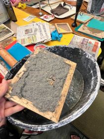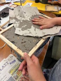 Mit Hilfe von Holzrahmen und Sieben schöpften die Kinder anschließend die Pulpe aus den Wannen und formten daraus ihr eigenes Papier. Ganz fertig war es aber noch nicht – zuerst musste es noch in Ruhe trocknen.